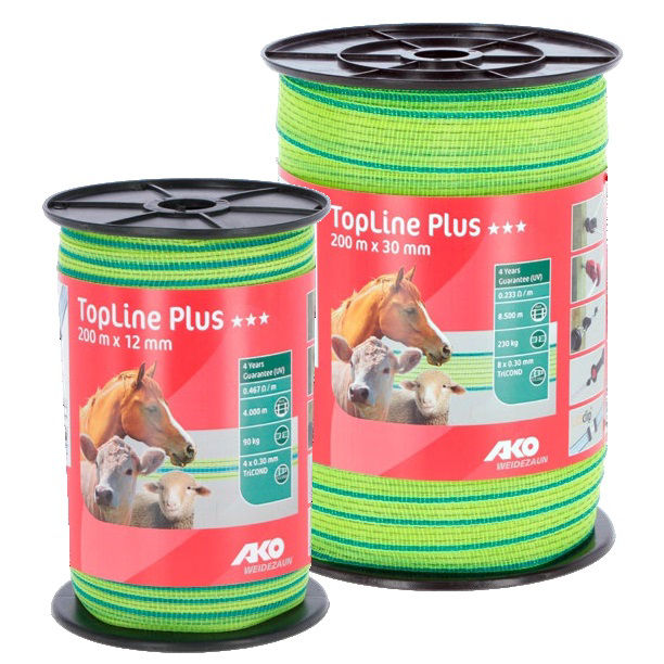 AKO TopLine Plus garandeert een uitstekende geleiding en kwaliteit voor de inzet van kleine tot middelgrootte afrasteringen. In vergelijk met RVS draden van gelijke sterkte lint, draad en koord, heeft de TopLine Plus door de RVS draden met TriCOND een 5x hogere geleiding. Daardoor heeft het een zeer lage weerstand en een 5x zo sterke werking.