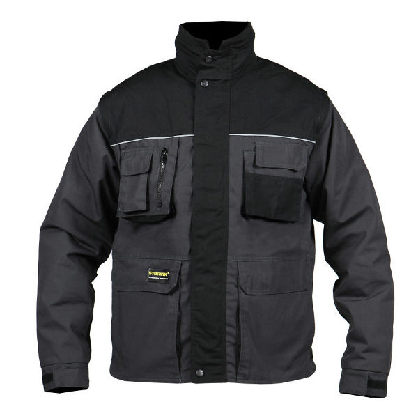 Aron werkjack. Sterke werkjas met uitneembare bodywarmer. Water afstotend. Voorzien van borstzakken met flap, telefoonzakje, twee zakken met klep aan voorzijde, afritsbare mouwen en reflecterende bies rondom.
