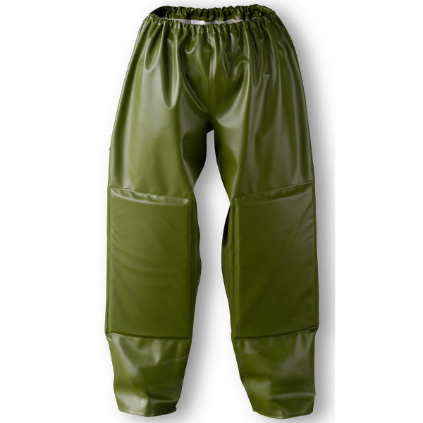 Kruipbroek. Elastiek in de taille, op kniehoogte waterdicht ingelaste schuimstukken, 83% polyvinylchloride/ 17% polyester.Kleur: groen, maat S.