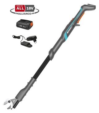 De Accu-takkenschaar EasyCut 110/18V P4A Gebruiksklare set van GARDENA helpt je gemakkelijk takken te snoeien in bomen en struiken. Dankzij het lage gewicht van slechts 2,3 kg met accu ligt het product comfortabel in je handen tijdens de boomverzorging. Bereik takken tot wel 2,5 m hoog, comfortabel vanaf de grond. Dankzij de krachtige ondersteuning van de POWER FOR ALL-accu kan je sneden maken zonder veel kracht te gebruiken. De originele GARDENA-messen zijn gemaakt in Duitsland van gehard staal en zorgen voor een nette en soepele snede in vers hout met een diameter tot wel 28 mm. Ze zijn precisiegeslepen en hebben een antikleeflaag, waardoor geknipt materiaal niet aan de smalle schaarkop blijft plakken. De EasyCut is comfortabel in gebruik met een perfecte balans, dankzij de ergonomische handgreep. De geïntegreerde ledindicator in de ergonomische handgreep toont je de laadstatus van de accu. Wanneer hij volledig is opgeladen zijn er tot wel 400 sneden mogelijk. De GARDENA Accu-takkenschaar EasyCut 110/18V P4A wordt geleverd als gebruiksklare set met een snellader en krachtige 18V POWER FOR ALL-accu. De POWER FOR ALL ALLIANCE is een van de grootste merkoverschrijdende accu-allianties van toonaangevende fabrikanten, wiens accu's je kan gebruiken in talrijke apparaten in huis en tuin. Zo bespaar je geld maar blijf je toch flexibel! Na een eenvoudige online registratie biedt GARDENA een fabrieksgarantie van 3 jaar op de Accu-takkenschaar. Passion powered by GARDENA. EEN accusysteem voor alle taken in je tuin.