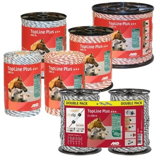 AKO TopLine Plus garandeert een uitstekende geleiding en kwaliteit voor de inzet van kleine tot middelgrootte afrasteringen. In vergelijk met RVS draden van gelijke sterkte lint, draad en koord, heeft de TopLine Plus door de RVS draden met TriCOND een 5x hogere geleiding. Daardoor heeft het een zeer lage weerstand en een 5x zo sterke werking.