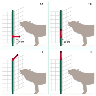 gemonteerd op palen in het pluimveenet en voorzien van een geëlektrificeerde draad, houdt de WolfStop ook vossen weg van de pluimveeren (montage in positie 1.A, idealiter dicht bij de grond)