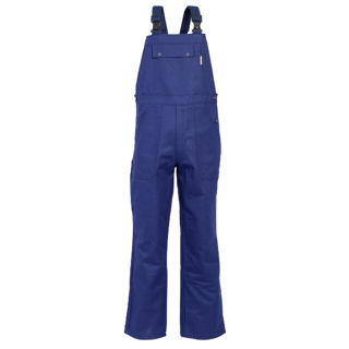 2 intasten, borstzak met klep en pennenzakje, achterzak en duimstokzak. Verstelbare taille d.m.v. knopen en verstelbare elastische schouderbanden.