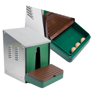 • De opvangbak voor de eieren is gemaakt van zeer sterk ABS kunststof. Het bruine deksel van de opvangbak scharniert en geeft toegang tot de eieren.