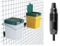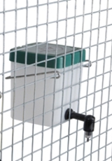 De fles is gemaakt van kunststof (pp) en de nippelhouder van een zeer sterk kunststof. De RVS nippel die hierin gedraaid is, heeft een zeer lange levensduur. Lekkage kan eigenlijk niet voorkomen maar mocht dit toch gebeuren dan is het in 99% van alle gevallen vervuiling van de nippel. Schoonmaken met bijv. chloor werkt dan perfect. De fles heeft een vierkante deksel die afneembaar is om de fles te reinigen. Op deze deksel zit een ronde witte vulschuif of klapdeksel. Deze wordt gebruikt voor het vullen van de fles. De fles wordt geleverd incl. een verzinkte beugel voor het vastzetten van de fles aan het gaas.