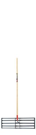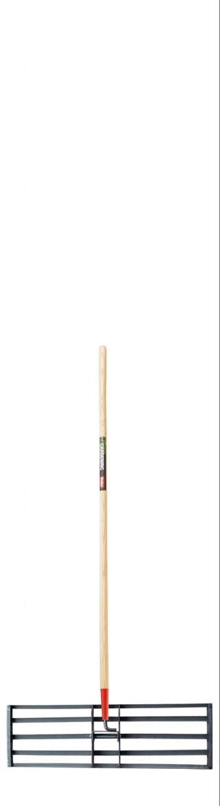 De RVS egaliseerhark nivelleert grond en gras beter en sneller dan een standaard tuinhark, zodat men het gazon vlak en mooi kan houden.