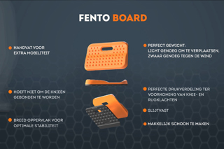 De FENTO BOARD is een handzame kniemat of kniekussen van hoogwaardige kwaliteit, makkelijk te verplaatsen dankzij de handgreep aan de voorzijde, met een slijtvaste onderzijde. De FENTO BOARD is ideaal voor mensen die een stevige en ergonomische kniebescherming zoeken, zonder deze zelf aan de knieën te dragen.
