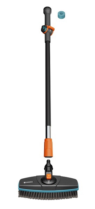 Grondige oppervlaktereiniging in een handomdraai. De borstel en steel met watergeleider en shampoohouder vormen de ideale uitrusting voor grondige reiniging buitenshuis. Serres, veranda's en andere gevoelige oppervlakken glanzen weer als nieuw dankzij deze reinigingsset. Een eenvoudige klik is alles wat nodig is om de tuinslang aan te sluiten op het handvat. De reinigingsborstel wordt met een schroefverbinding aan het uiteinde van de steel bevestigd. De zeepring zit in het mengapparaat op de steel.