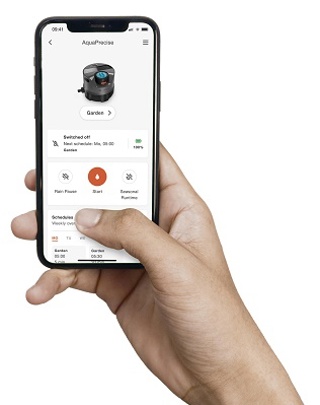 AquaPrecise heeft een handige roosterfunctie waarmee je eenvoudig de sproeicycli programmeert. De ingebouwde afsluiter gaat automatisch open en dicht volgens het schema dat je hebt ingesteld. Je kan precies de doorstroom en het verbruik volgen, waardoor je het water efficiënt kan gebruiken. Dit systeem is op afstand te besturen met een Bluetooth® app waarop je de instellingen regelt en de contourpunten invoert.