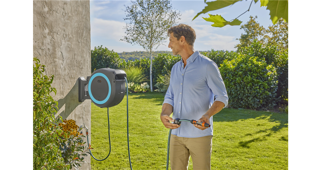 De innovatieve GARDENA PowerRoll XXL accu-wandslangbox, gebruiksklare set met accutechnologie voor automatisch uitrollen om comfortabel water te geven.