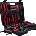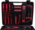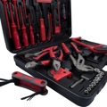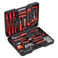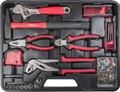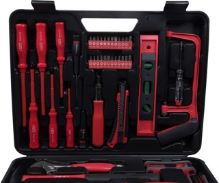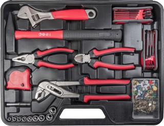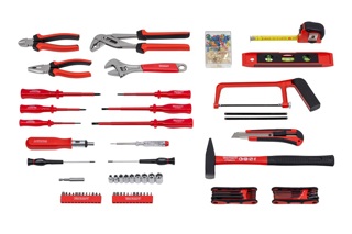 Solide basisuitrusting voor het dagelijkse huishoudelijke werk Compact formaat voor ruimtebesparend opbergen Inhoud: 1 combinatietang 160 mm1 zijsnijder 160 mm1 waterpomptang 250 mm1 mechanische hamer 300 g1 rolmaat 3 m1 spanningstester6 schroevendraaier geïsoleerd: PH0 x75 mm, PH1 x 100 mm, PH2 x 100 mm, 0, 8 x 4 x 100 mm, 1 x 5,5 x 125 mm, 1,2 x 6,5 x 150 mm2 fijnmechanische schroevendraaier, afm. Sleuf 3 x 75 mm, PH0 x 75 mm1 Verstelbare sleutel 200 mm1 Bitschroevendraaier met ratelfunctie9 Dopsleutel-inzetstukken 1/4" maat 5-6-7-8-9-10-11-12-13 mm5 Schroefinzetstukken 1/4 "gleufgrootte. 3-4-5-6-7 mm6 schroefinzetstukken 1/4" zeskantgrootte 2-3-4-5-5,5-6 mm3 schroefinzetstukken 1/4" Pozidriv-grootte. 1-2-33 schroefbits 1/4" kruisgleufgrootte 1-2-36 schroefbits 1/4" TX-grootte. 10-15-20-25-30-401 Dopsleuteladapter 1/4"1 Bithouder magnetisch1 Hobbyzaag 150 mm2 Vervangingszaagbladen voor hobbyzaag (metaal/hout) 150 mm8 Inbussleutel Torx8 Inbussleutel zeskant1 Universeel mes, twee- onderdelenhandgreep2 Afbreekmesjes 18 mm, voor universeel mes1 Torpedo-Spirit-waterpas 225 mm, met magneet1 huishoudelijk assortiment kleine strijkijzers (spijkers, prikbordspelden, schilderijhaken met spijkers)