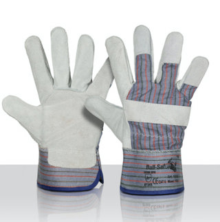 Werkhandschoen. Cowsplitleder Amerikaantje met rood/blauw streepdoek. EN 388.