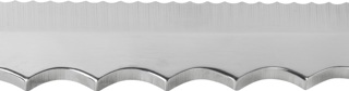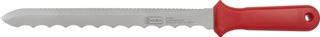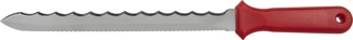 Blad 280 mm, roestvrij edelstaal, met vingerbeveiliging op greep, voor het snijden van glasvezel en andere isolatie- en schuimmaterialen, "zaagsnede" voor dicht en hard materiaal, "golfsnede" voor zachten licht materiaal, mespunt geschikt voor het boren van gaten. (Naslijpen in de lengterichting van het mes, aan de achterzijde van de tanden)