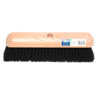 FSC. Rond hout blank gelakt. Zachte kunsthaar (PPN) 0.2mm zwart. Voor het verwijderen van droog fijn vuil op gladde oppervlakken zoals tegels en houten vloeren.