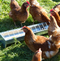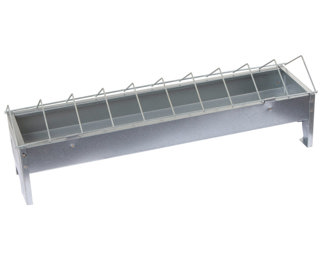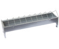 lange verzinkte voerbak voor pluimvee. geheel verzinkt, met draad overspannen en staat op pootjes.