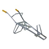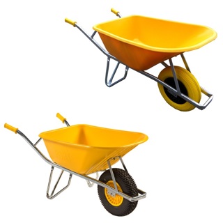 Zogenaamde stratenmakers kruiwagen. Geschikt voor het allerzwaarste werk, voor stratenmakers en hoveniers. Diepe bak van hoogwaardig, onverwoestbaar en slagvast kunststof (lope), in de signaalkleur geel (ral 1021), uv gestabiliseerd, met versterkingsribben op de bodem. Zon- en vorstbestendig. Onderstel van ovale stalen buis, gegalvaniseerd, onder de bak doorlopend, uit 1 stuk gebogen inclusief de kiepbeugel, met extra kopsteun, aangelaste poten, bakschoren, dwarsversterking tussen de poten, anti-slijtsloffen aan de poten en extra versterkte wielophanging. Geprofileerde geel kunststof veiligheidshandgrepen.