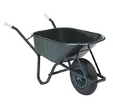 universele bouwkruiwagen. rondneus model. bak van plaatstaal, naadloos geperst met een ronde neus en dubbel omgelegde rand. onderstel uit ronde stalen buis, uit 1 stuk gebogen inclusief kiepbeugel, kopsteun en bakschoren. aangelaste dwarsversteviging tussen de poten en anti-slijtsloffen aan de poten. onderstel en bak zijn d.m.v. verstevigingssteunen tot 1 geheel samengelast en daarna in milieuvriendelijke groen-blauwe lak op waterbasis gedompeld. geprofileerde kunststof veiligheidshandvatten.