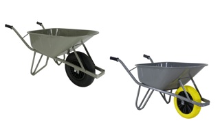 Universele, zware bouwkruiwagen. Rondneus model. Bak van plaatstaal, naadloos geperst met ronde neus en dubbel omgelegde rand. Onderstel uit ovale stalen buis, uit 1 stuk gebogen inclusief kiepbeugel en bakschoren. Aangelaste dwarsversteviging tussen de poten en anti-slijtsloffen aan de poten. Onderstel en bak zijn d.m.v. verstevigingssteunen tot 1 geheel samengelast en daarna in milieuvriendelijke grijze lak op waterbasis gedompeld. kunststof veiligheidshandvatten.