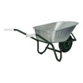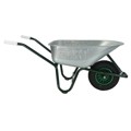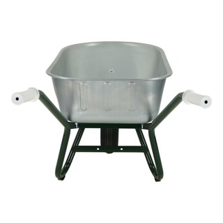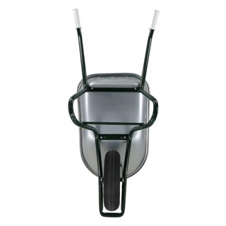 universele bouwkruiwagen. rondneus model. bak van plaatstaal, verzinkt, naadloos geperst met ronde neus en dubbel omgelegde rand. onderstel uit ronde stalen buis, in milieuvriendelijke groen-blauwe lak op waterbasis gedompeld, uit 1 stuk gebogen inclusief kiepbeugel, kopsteun en bakschoren. aangelaste dwarsversteviging tussen de poten en anti-slijtsloffen aan de poten. bak is d.m.v. boutjes aan onderstel en kopsteun bevestigd. wiel bestaande uit polypropyleen kunststof velg, kleur groen, met tubeless buitenband 16 x 4 inch - 2 ply. rollager met vetvulling, stofdoppen en massieve as. geprofileerde kunststof veiligheidshandvatten.