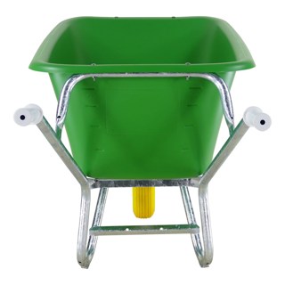 stalkruiwagen, met 1 NooitMeerLek wiel. voor gebruik in de grotere tuin, kwekerij, manege of andere agrarische toepassingen. geschikt voor alle materialen, met name voor voedsel, hooi enz. diepe, rechte bak van polyethyleen (hdpe) kunststof, slagvast en u.v. gestabiliseerd en met voedselgoedkeuring. onderstel uit ronde stalen buis, thermisch verzinkt, uit 1 stuk gebogen, met totale ondersteuning van de bak. aangelaste dwarsversteviging tussen de poten en anti-slijtsloffen aan de poten. bak is d.m.v. roestvaststalen boutjes op het onderstel gemonteerd. wiel bestaande uit polypropyleen kunststof velg, kleur groen, rollager met vetvulling, stofdoppen en massieve as. geprofileerde kunststof handvatten.