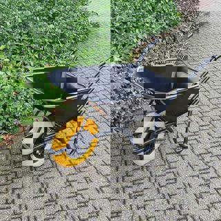 Deze kruiwagen heeft een stang voor de band waardoor kiepen uiterst makkelijk is.