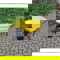 Deze kruiwagen heeft een stang voor de band waardoor kiepen uiterst makkelijk is.