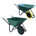 bouwkruiwagen met rechte neus. geschikt voor alle klussen in de tuin en om het huis en voor de zwaarste bouwmaterialen, stenen, tegels enz. vlakke bak met rechte neus van slagvast polypropyleen kunststof, kleur groen, uv gestabiliseerd, met versterkingsribben op de bodem. onderstel uit ronde stalen buis, in milieuvriendelijke groen-blauwe lak op waterbasis gedompeld, uit 1 stuk gebogen inclusief de kiepbeugel, met extra kopsteun en dwarsversterking tussen de poten. geprofileerde kunststof handvatten.