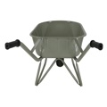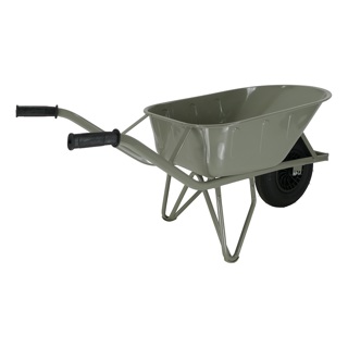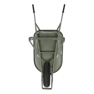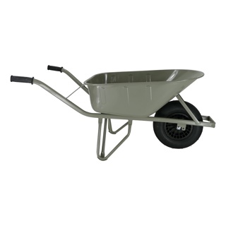 Universele, zware bouwkruiwagen. Rondneus model. Bak van plaatstaal, naadloos geperst met ronde neus en dubbel omgelegde rand. Onderstel uit ovale stalen buis, uit 1 stuk gebogen inclusief kiepbeugel en bakschoren. Aangelaste dwarsversteviging tussen de poten en anti-slijtsloffen aan de poten. Onderstel en bak zijn d.m.v. verstevigingssteunen tot 1 geheel samengelast en daarna in milieuvriendelijke grijze lak op waterbasis gedompeld. Wiel kunststof velg, kleur zwart, kunststof veiligheidshandvatten.