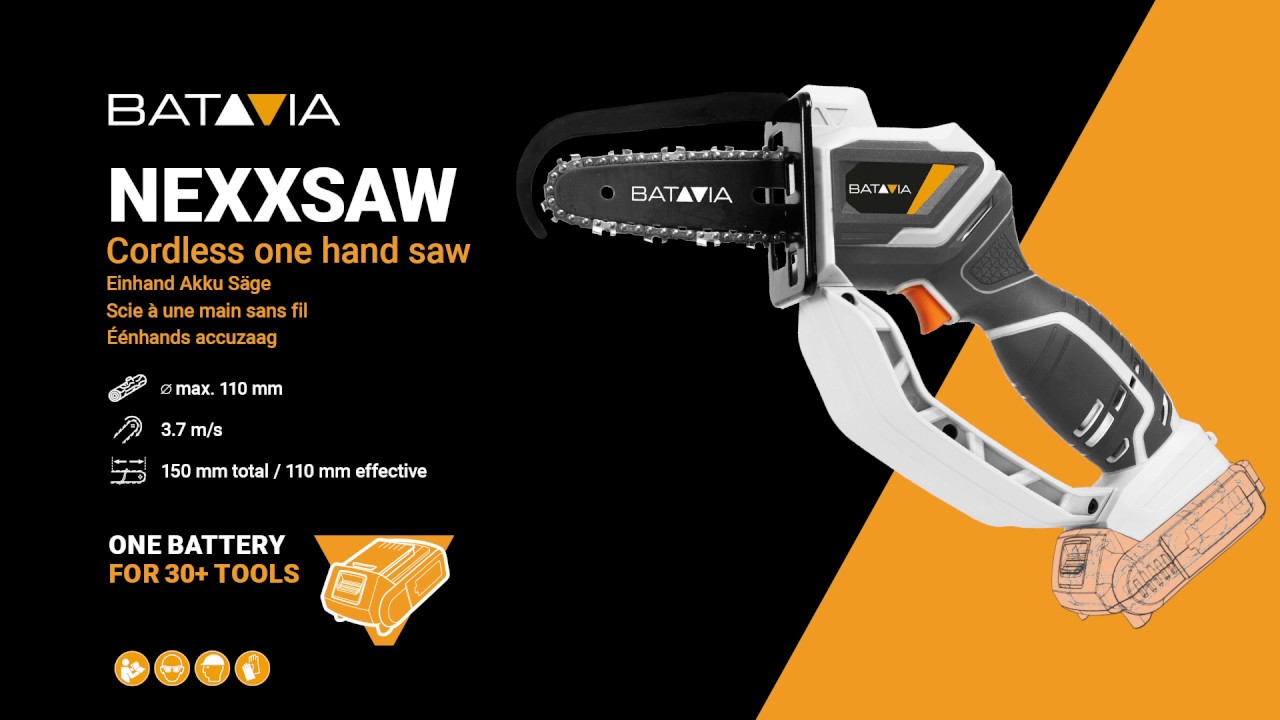 Hij is niet voor niks door het Engelse magazine DIY Week uitgeroepen tot Garden Tool of the Year en Power Tool of the Year 2020: de Batavia Nexxsaw. Deze handzame, compacte eenhands kettingzaag op accu is klein van stuk, maar groots in resultaat. We zijn enorm trots op dit innovatieve product en introduceren nu het nieuwste model. Ten opzichte van zijn voorganger hebben we aantal upgrades gedaan die het gebruikersgemak ten goede komen. Marktintroductie: maart 2021