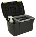 Deksel met twee stevige sluitingen, uitneembare inzet, borstelhouder en handgreep.