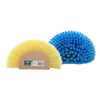 Zachte kunstvezels blauw en geel. Voor het verwijderen van spinnenwebben en ander vuil langs plinten en randen van daken en plafonds.