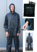 Blauw regenpak bestaande uit een jas en een broek met elastische taille band.