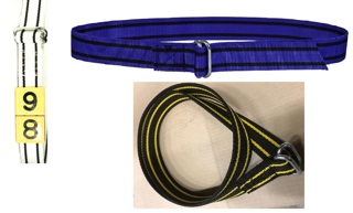 Riem nylon knelgesp 130cm, blauw / zwarte strepen