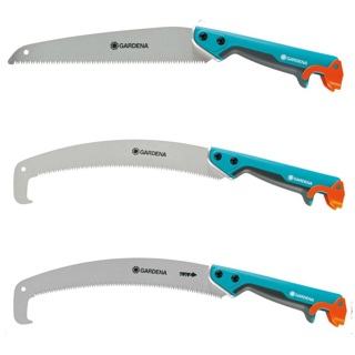 G8738: heeft een gebogen zaagblad met aan beide zijden geslepen, gezette tanden, impulsgehard om krachtbesparend te zagen. Met een takhaak voor gemakkelijk weg trekken van takken.