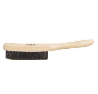 Houten handborstel met rijen staaldraadjes voor het ontroesten en schoonborstelen van diverse materialen.