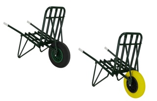 steenkruiwagen. onderstel uit ovale stalen buis, onder laadvlak doorlopend, gecombineerd met stalen u-profielen. aangelaste poten met dwarssteunen en anti-slijtsloffen aan de poten. het staande voorvlak is uit ovale buis vervaardigd. het geheel is in milieuvriendelijke groen-blauwe lak op waterbasis gedompeld. met luchtband of antilekwiel. rollager met vetvulling, stofdoppen en massieve as. geprofileerde kunststof handvatten.