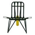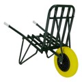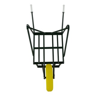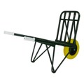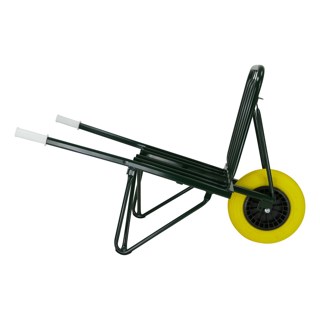steenkruiwagen. onderstel uit ovale stalen buis, onder laadvlak doorlopend, gecombineerd met stalen u-profielen. aangelaste poten met dwarssteunen en anti-slijtsloffen aan de poten. het staande voorvlak is uit ovale buis vervaardigd. het geheel is in milieuvriendelijke groen-blauwe lak op waterbasis gedompeld. wiel bestaande uit polypropyleen kunststof velg, kleur groen, met antilekwiel. rollager met vetvulling, stofdoppen en massieve as. geprofileerde kunststof handvatten.