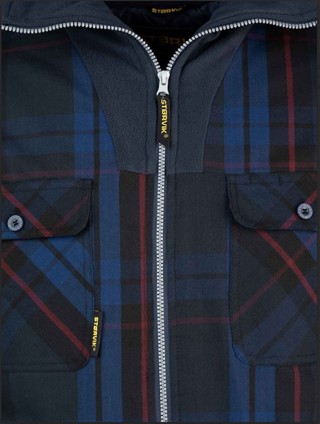 Het thermohemd heeft twee borstzakken met knoopsluiting, twee open heupzakken, een knoopsluiting bij de armen en een hoge kraag van fleece stof.