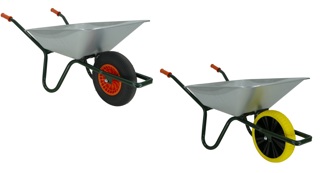 lichte kruiwagen voor het gebruik in de tuin en om het huis, geschikt voor bladeren, gras, zand en lichte materialen. gegalvaniseerde bak van 85 liter inhoud. frame uit 1 stuk gebogen, daardoor sterk en toch lichtgewicht, met kiepbeugel. gewicht 11,4kg.