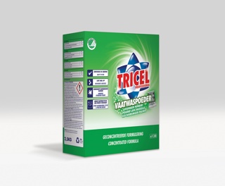 Tricel ECO vaatwaspoeder zit in een milieuvriendelijke kartonnen doos,