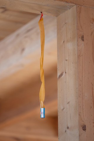 -gebruik de rode band om de opgerolde twister voorzichtig uit de lauwwarme koker te trekken en gebruik de bijgeleverde punaise om hem aan het plafond te bevestigen