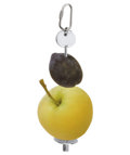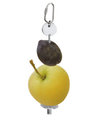 Het versvoer wordt op de spies geprikt en aan de kooitralies opgehangen, zodat het voer niet vuil kan worden. Gelijktijdig zorgt de houder uit verchroomd metaal voor plezier en bezigheid, omdat hij bij het eten heen en weer beweegt en zo het voer op speelse wijze gegeten moet worden.