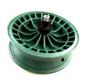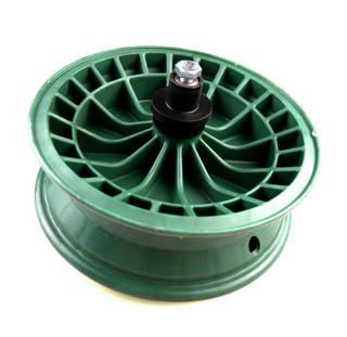 polypropyleen kunststof, kleur groen. geen roestvorming en geen vastroestend lager. zonder luchtband. voor kruiwagenwiel 16 x 4" (400x100 mm). as met binnenschroefdraad aan de uiteinden met rollenlager, stofdoppen tegen het indringen van vuil en 2 wielbouten.