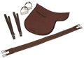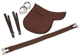 complete startersset bestaande uit lederen zadel, zadeldek, stijgbeugels, stijgbeugelriemen en singel (125 cm).